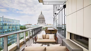 Designed for creative and well-traveled spirits, the AC Hotel Madison Downtown resides in the center of downtown Madison, just steps from Capitol Square. One of the most convenient Madison, WI hotels, we feature spacious guest rooms, intuitive service, and a variety of amenities, including free Wi-Fi, to help you make the most of your stay. Relax and rejuvenate in your well-appointed hotel room or suite, work out at our cutting-edge fitness center, and marvel at the views at Eno Vino, one of the best rooftop restaurants in downtown Madison, Wisconsin.