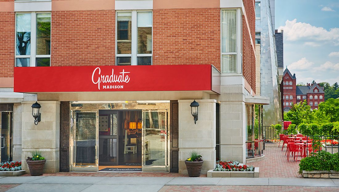 The Graduate Madison is located just steps from Madison’s iconic State Street district’s dining and shopping, and a stone’s throw from the Memorial Union. The Graduate offers unique amenities near the heart of UW-Madison’s campus. Enjoy Camp Trippalindee, a summer camp themed rooftop bar with breathtaking views of the State Capitol and picturesque Lake Mendota, a café serving coffee and all-day breakfast in the lobby, and a 24-hour onsite gym. Enjoy a room design inspired by the lakeshore and college lifestyle complete with cozy beds, workstations, an HD TV, docking stations, and a lounge chair. Valet parking is available for an additional fee.